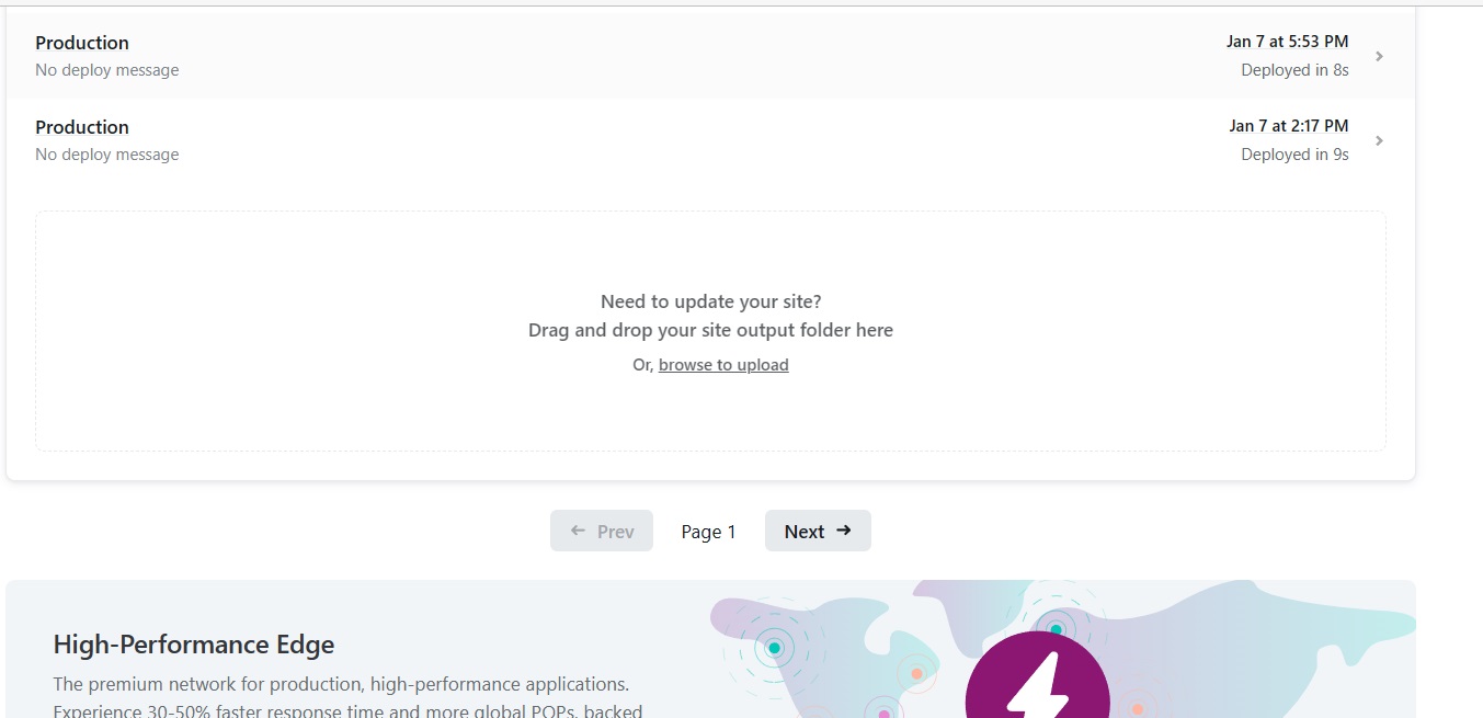 この画面中央に出ている「Need to update your site?Drag and drop your site output folder here」